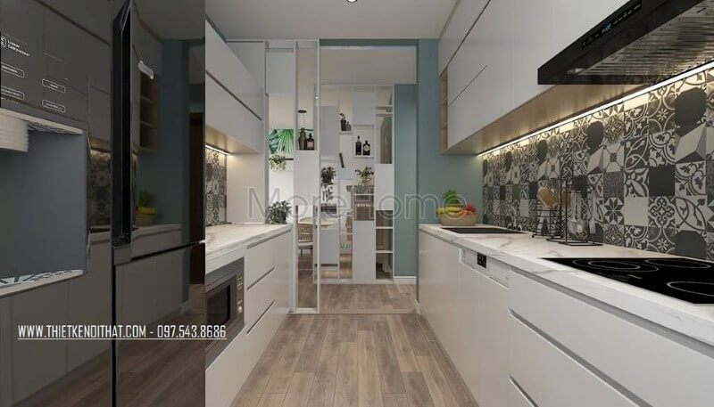 Thiết kế phòng bếp chung cư hiện đại, với nội thất tone màu trắng đơn giản và tiện nghi cho người nội trợ