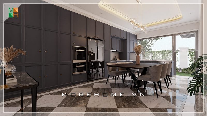 Thiết kế phòng bếp chung cư tân cổ điển sang trọng, thiết bị phòng bếp hiện đại tạo không gian nấu nướng tiện nghi cho người nội trợ