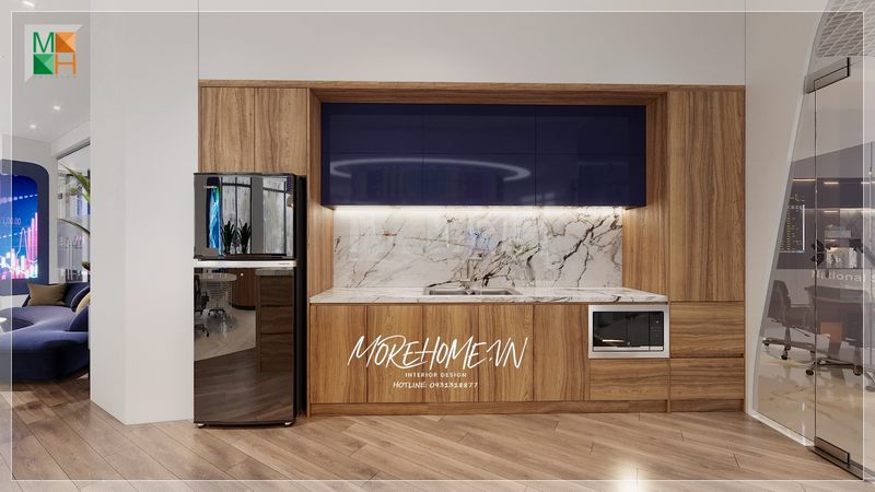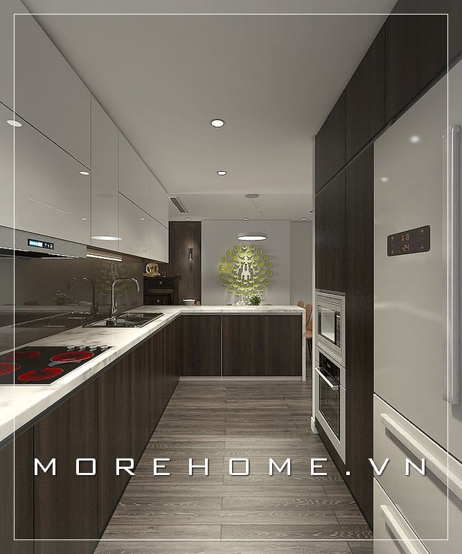 Tủ bếp gỗ công nghiệp mặt đá trắng vân mây hiện đại, dù diện tích không to lớn, vẫn mang lại sự tiện lợi và gọn gàng.