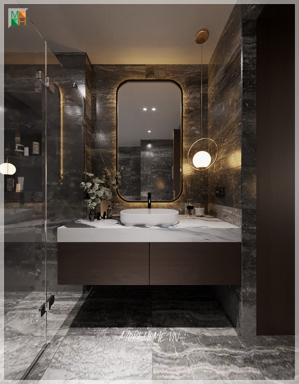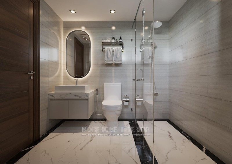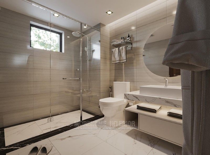 Vách tắm kính 180 độ phân chia rõ ràng 2 khu vực khô và ướt tranh sự ướt át khó chịu mà không gian phòng thông thoáng.