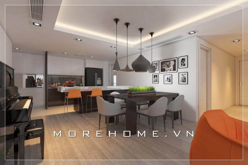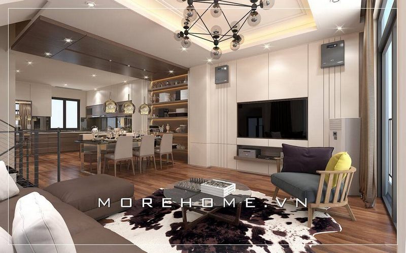 Thiết kế nội thất hiện đại, sang trọng và đẹp mắt cho không gian nhà phố, biệt thự bao gồm phòng khách liền bếp ăn.