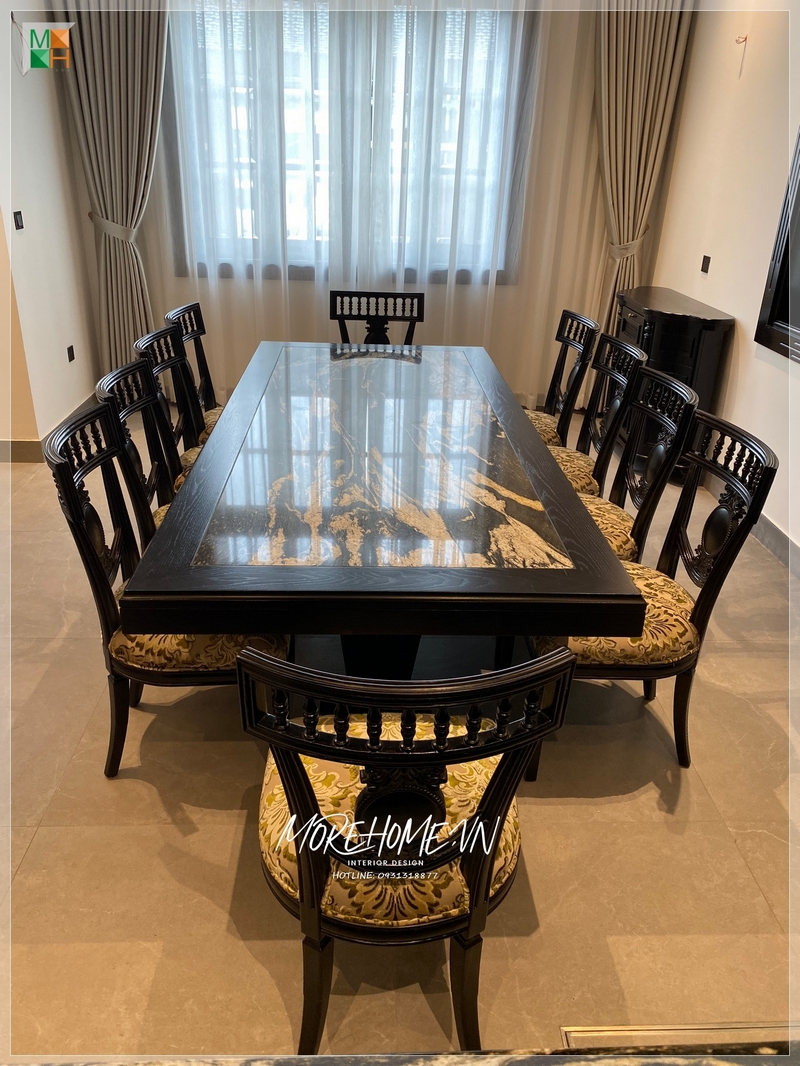 Bộ bàn ăn gỗ óc chó cao cấp có thiết kế tân cổ điển sang trọng, phù hợp với không gian phòng ăn chung cư cao cấp.